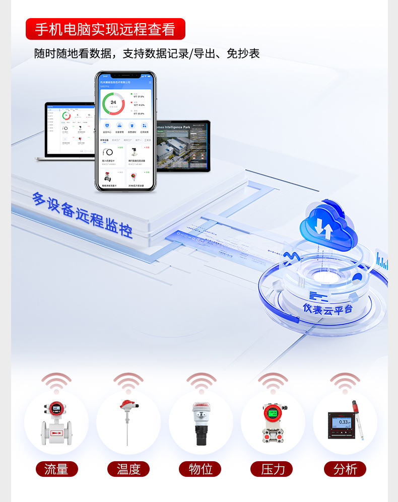 仪表云是基于工业物联网技术(IoT)及高品质仪表/传感器打“智能化造的一站式仪表服。务平台,旨在以“轻量化”的理念,将各类仪表数据上“云”,通过物联与大数据的技术为企业实现降本增效。